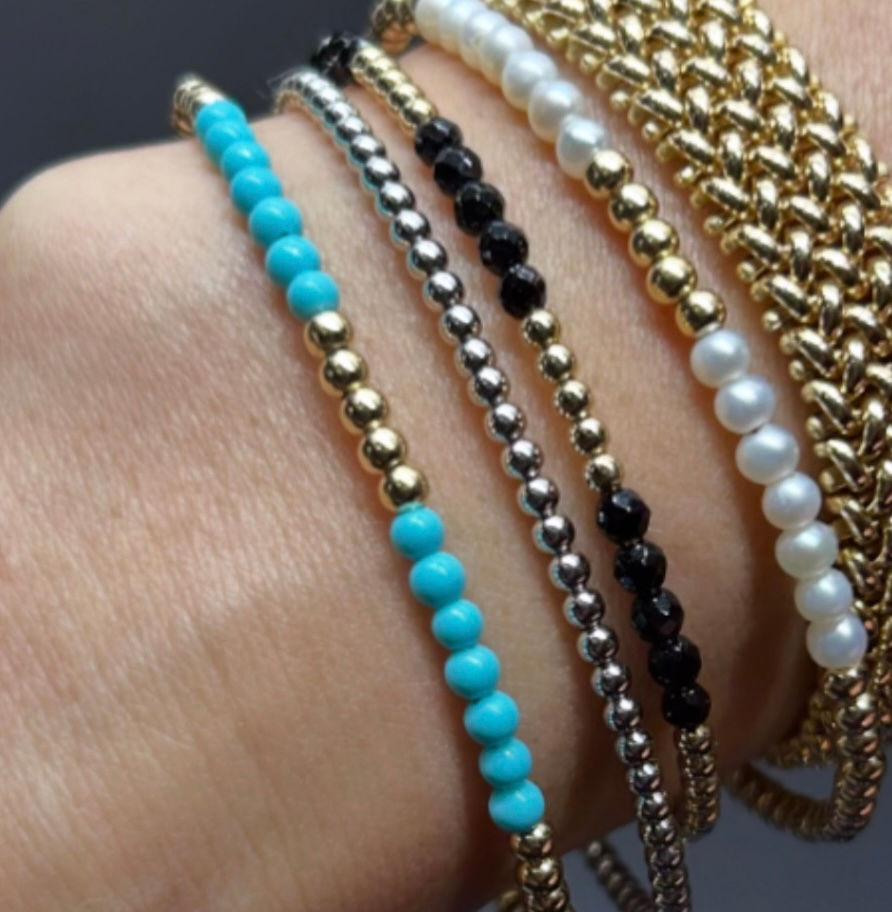 • 9K Yellow gold/Turkey stone ball beads strung together with gold string