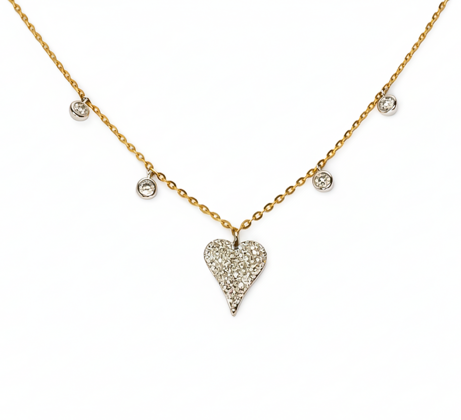 The Celestia Heart Diamond Necklace is a romantic expression of brilliance and grace. A delicately pavé-set diamond heart pendant rests at the center, shimmering with fine detail and light-catching texture. Along the chain, bezel-set diamonds are thoughtfully spaced, adding subtle sparkle that feels airy and refined rather than overwhelming.